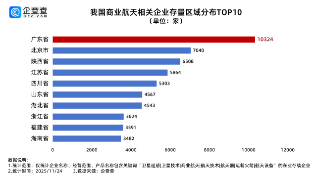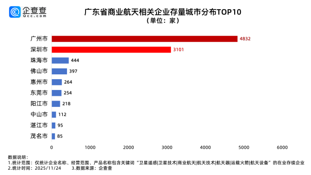 企查查数据显示,截至11月24日,我国现存超9万家商业航天相关企业,其中,近六成相关企业成立于近三年。其中广东省存量最多,为1.03万家,占比11.4%;省内城市分布上,广州现存4832家、深圳现存3101家,是省内商业航天相关企业存量最大的两个城市,其次是珠海、佛山、惠州等地,相关企业存量均在500家以内。